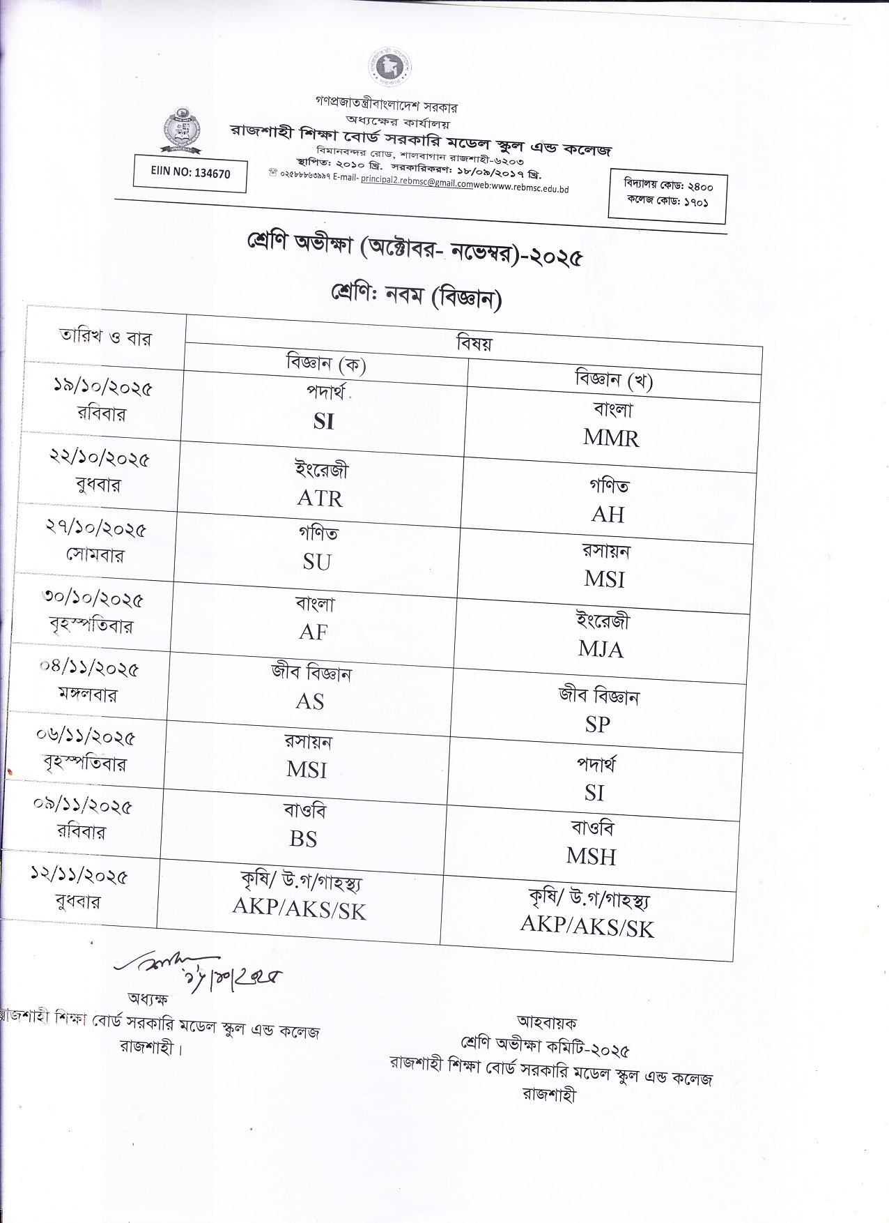 নবম, বিজ্ঞান শ্রেণি অভীক্ষার রুটিন