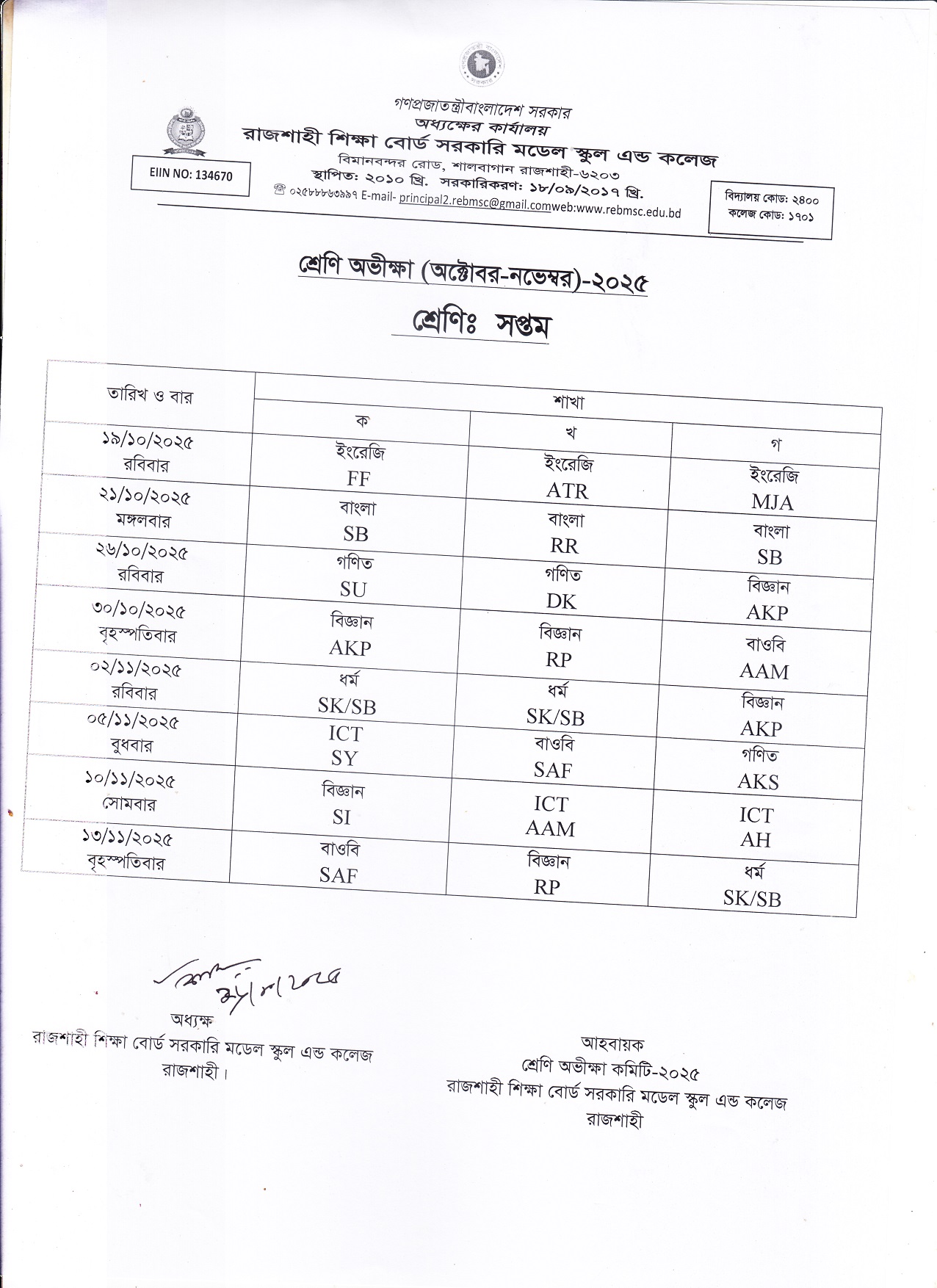সপ্তম, শ্রেণি অভীক্ষার রুটিন