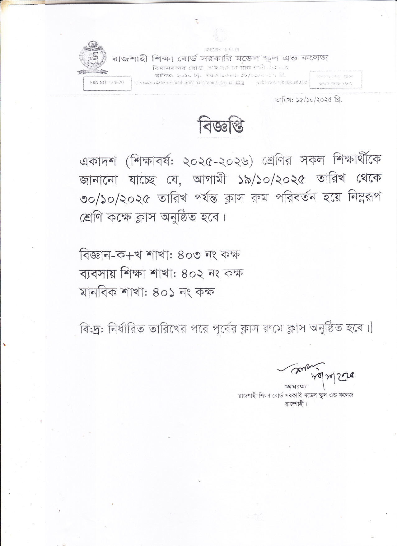 একাদশ শ্রেণির ক্লাস রুম পরিবর্তন সংক্রান্ত বিজ্ঞপ্তি।
