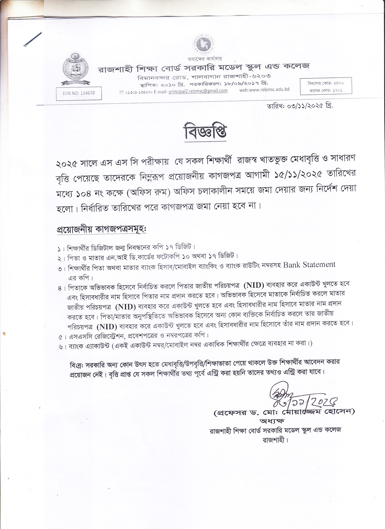 রাজস্ব খাতভুক্ত মেধাবৃত্তি ও সাধারণবৃত্তি সংক্রান্ত বিজ্ঞপ্তি।