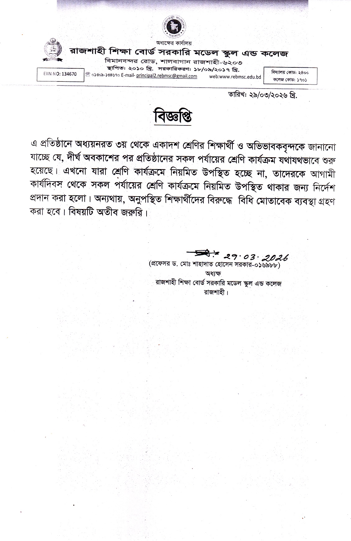 শ্রেণি কার্যক্রমে উপস্থিতি সঙক্রান্ত।