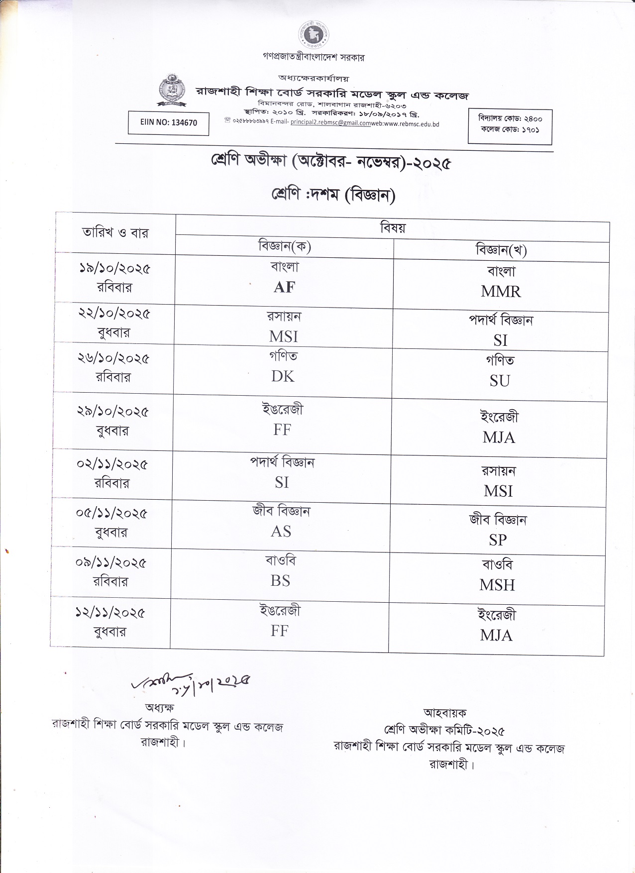 ১০ম শ্রেণির শ্রেণি অভীক্ষা রুটিন