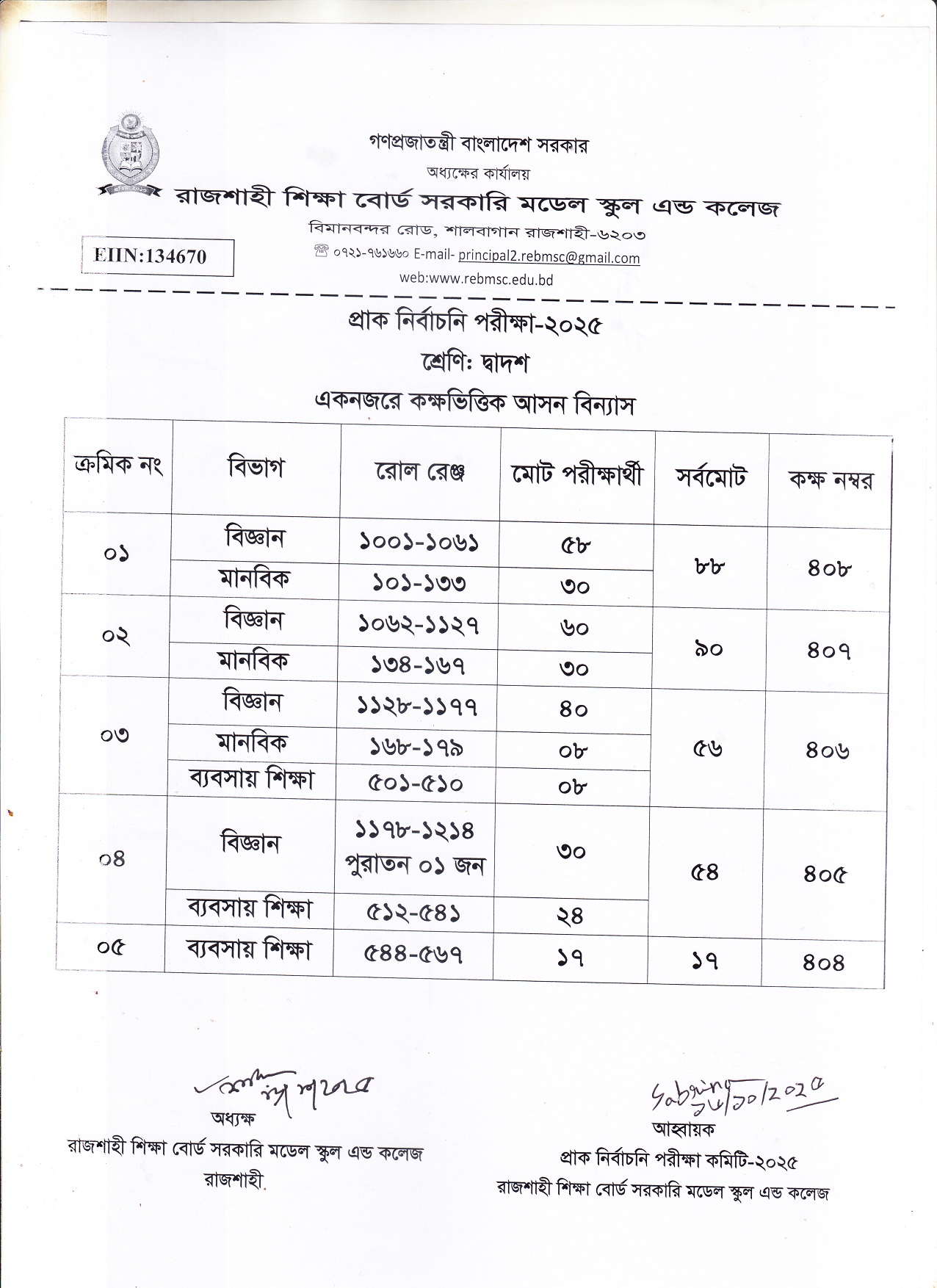দ্বাদশ শ্রেণির প্রাক-নির্বাচনী পরীক্ষা-২০২৫ এর আসন বিন্যাস