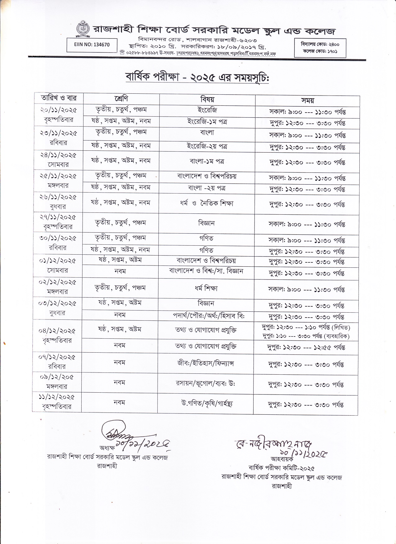 ৩য় থেকে ৯ম শ্রেণির বার্ষিক পরীক্ষার সময়সূচি-২০২৫