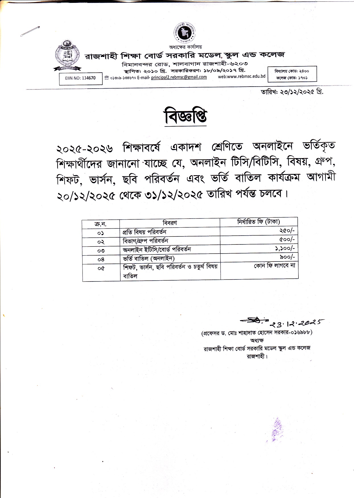 Download২০২৫-২৬ শিক্ষাবর্ষে একাদশ শ্রেণির অনলাইন টিসি ও ভর্তি বাতিল বিজ্ঞপ্তি।