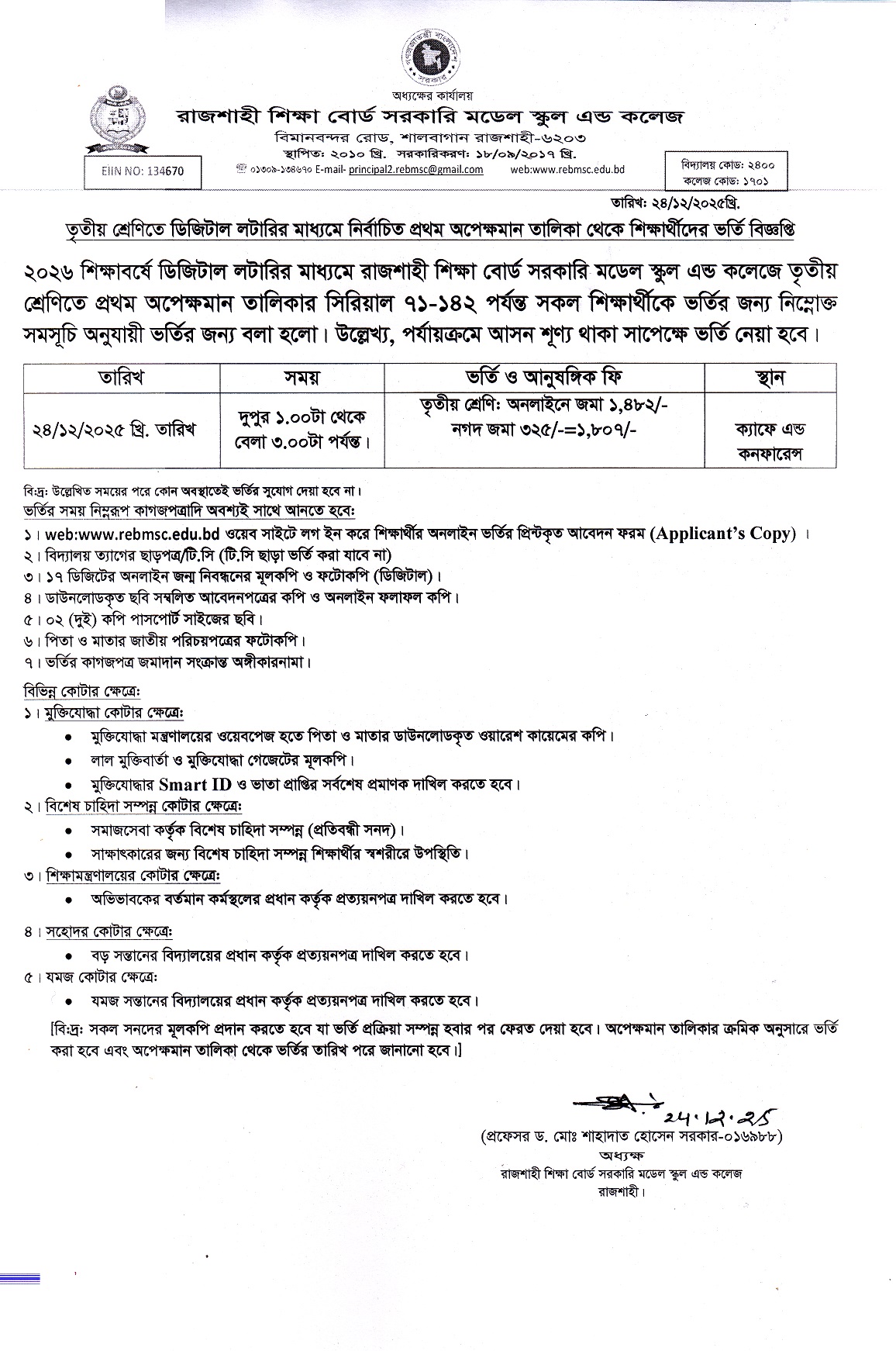 ১ম অপেক্ষমান তালিকা থেকে সিরিয়াল অনুযায়ী ভর্তি বিজ্ঞপ্তি।