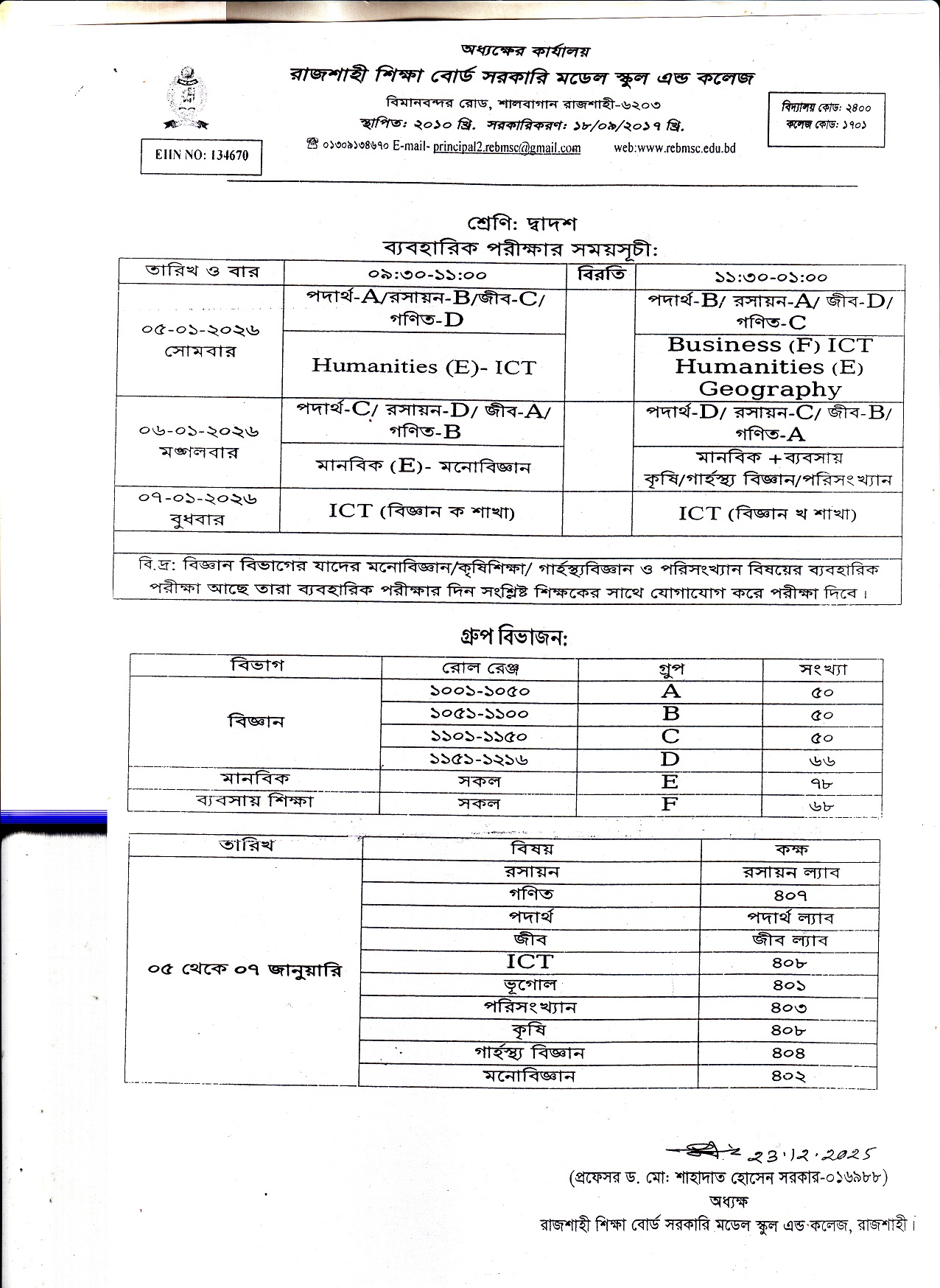 দ্বাদশ শ্রেণির ব্যবহারিক পরিক্ষার সময়সূচি