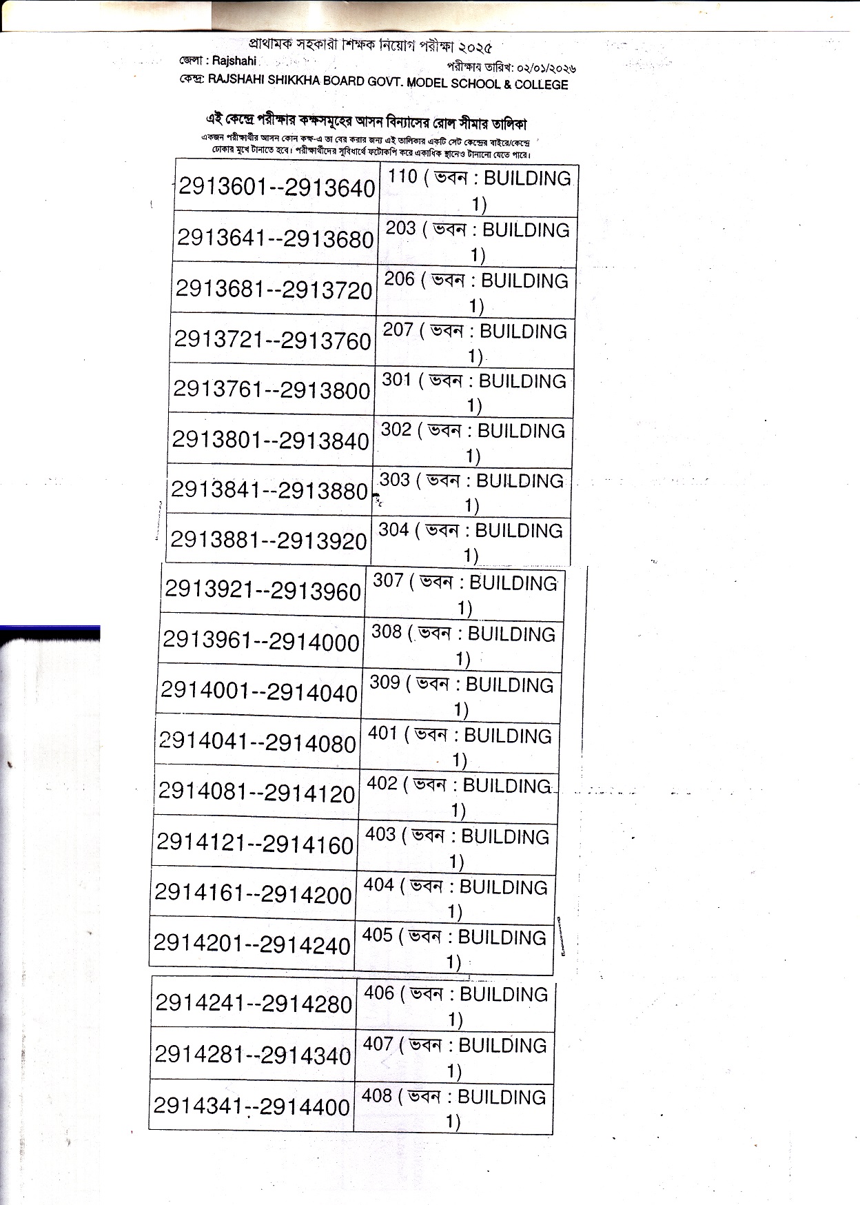 সহকারী শিক্ষক নিয়োগ পরীক্ষার আসন বিন্যাসের রোল সীমার তালিকা