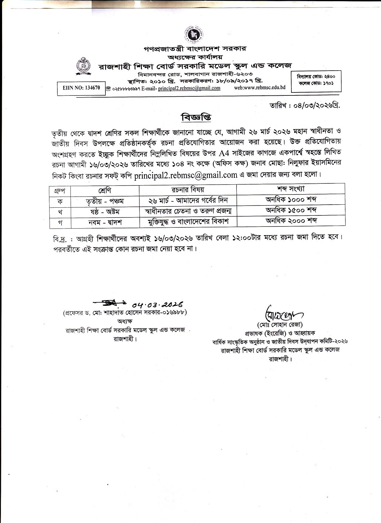 ২৬ মার্চ মহান স্বাধীনতা ও জাতীয় দিবস উপলক্ষে প্রতিযোগিতা