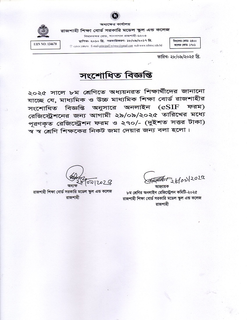 ৮ম শ্রেণির রেজিস্ট্রেশন সংক্রান্ত (সংশোধিত)