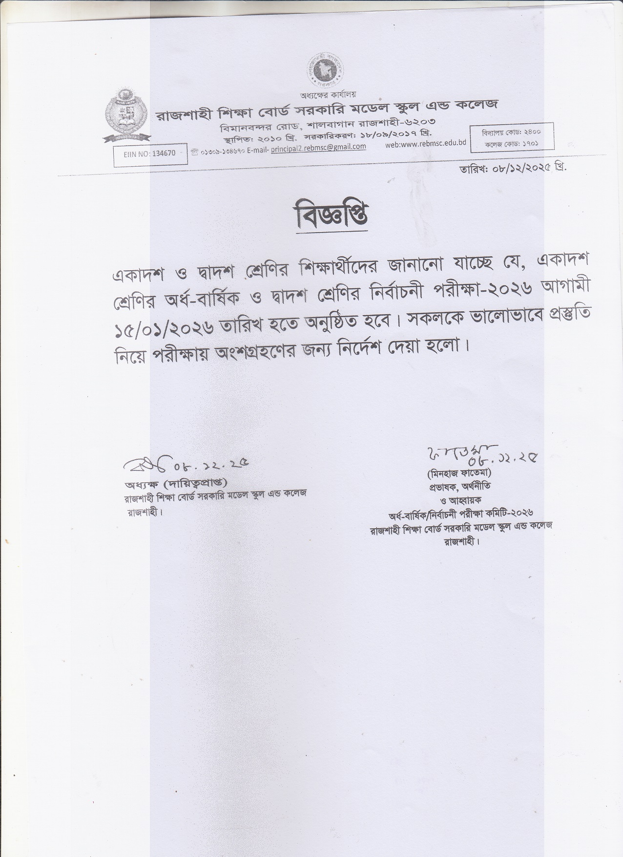 একাদশ শ্রেণির অর্ধ-বার্ষিক ও দ্বাদশ শ্রেণির নির্বাচনী পরীক্ষা-২০২৫ সংক্রান্ত