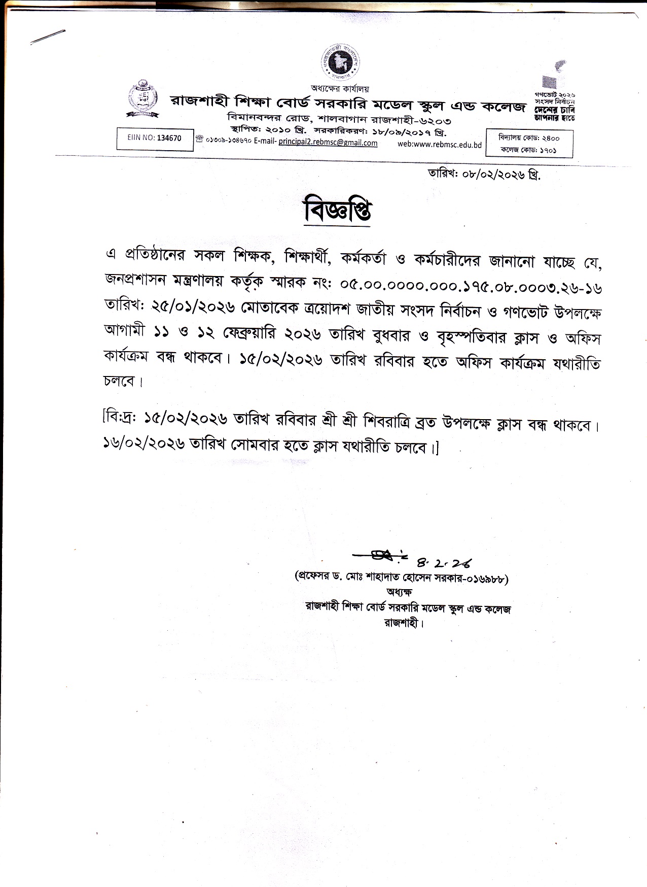 ক্রয়োদশ জাতীয় সংসদ নির্বাচন উপলক্ষে একাডেমিক ও অফিস ছুটি সংক্রান্ত।