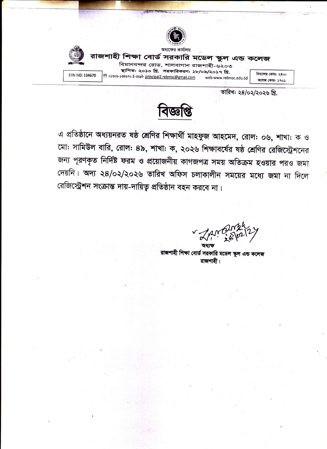 ০২ জন শিক্ষার্থীর ষষ্ঠ শ্রেণির রেজিস্ট্রেশন সংক্রান্ত।