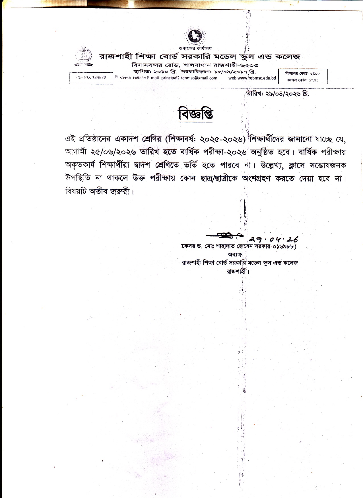 একাদশ শ্রেণির বার্ষিক পরীক্ষা সংক্রান্ত বিজ্ঞপ্তি।