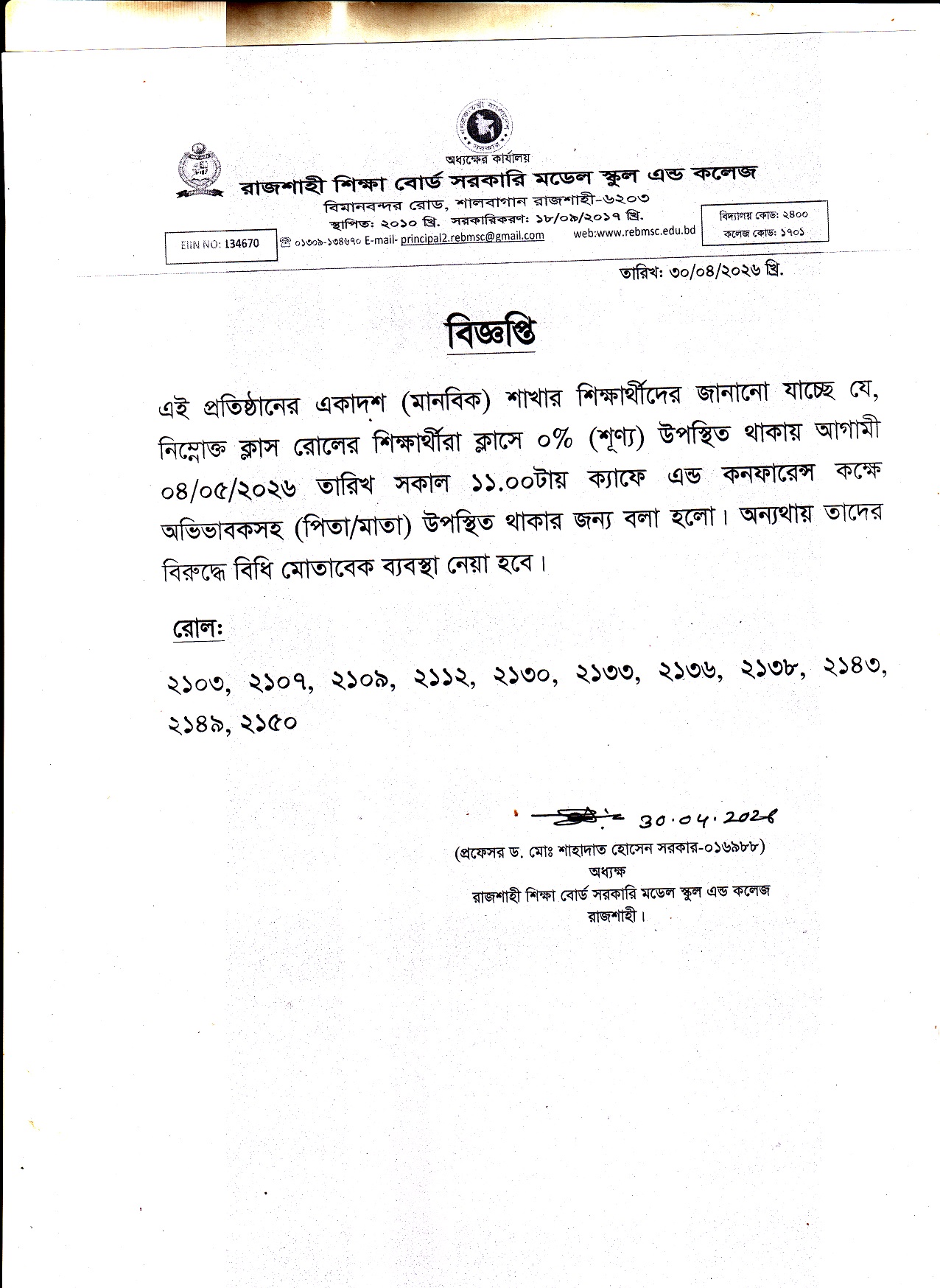 ক্লাসে ০% উপস্থিতি সংক্রান্ত।