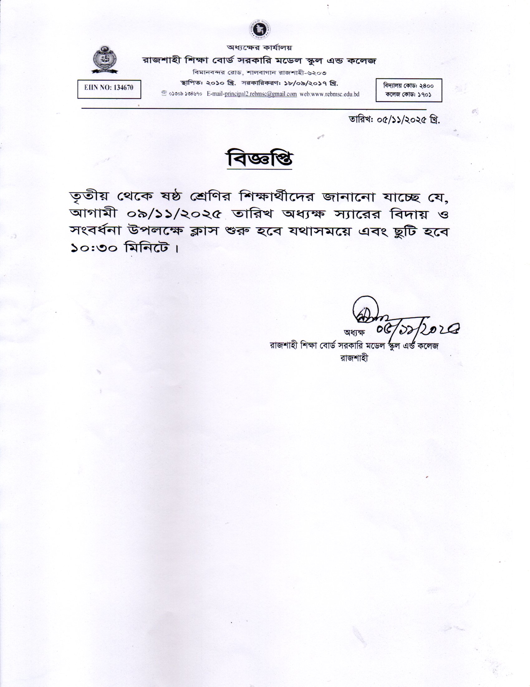 09/11/2025 তারিখ ছুটি হবে ১০:৩০মি.