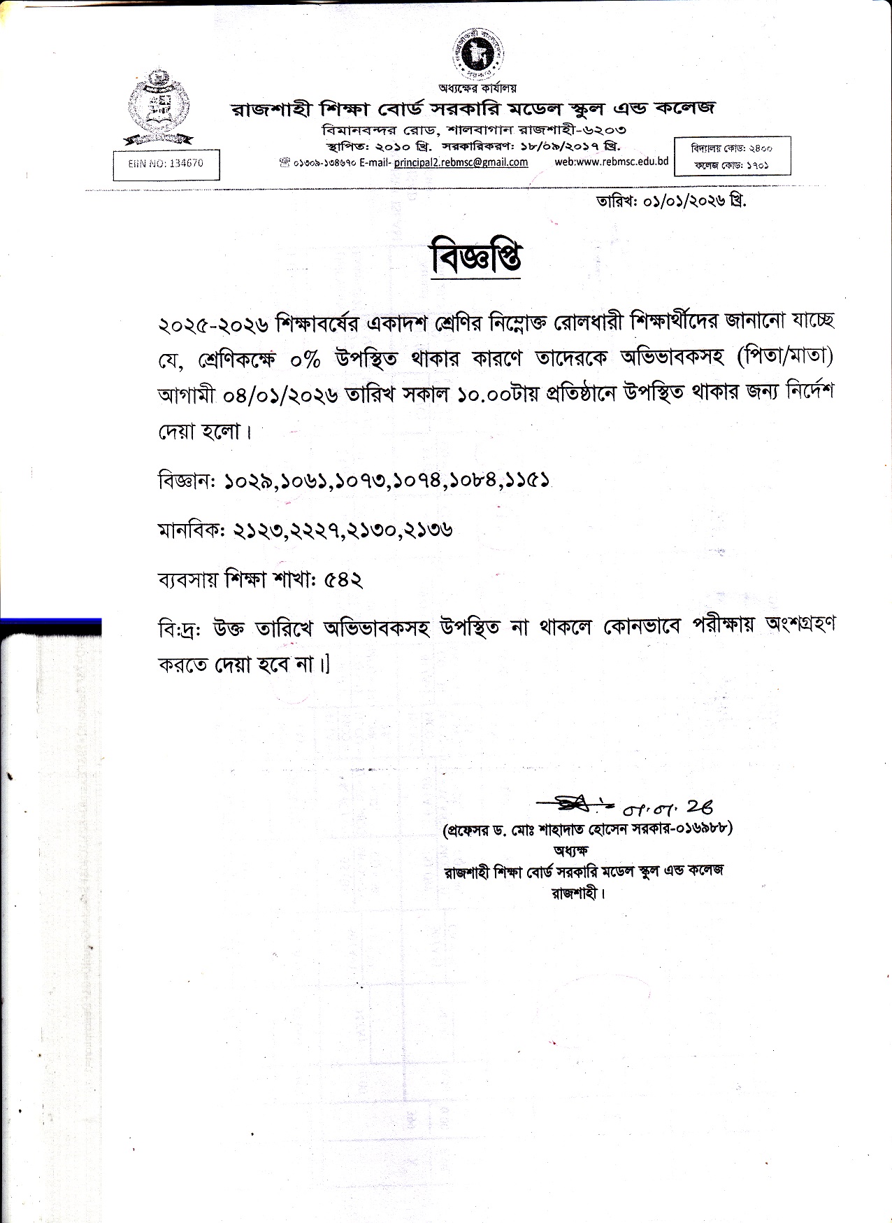 একাদশ শ্রেণির উপস্থিতি সংক্রান্ত।