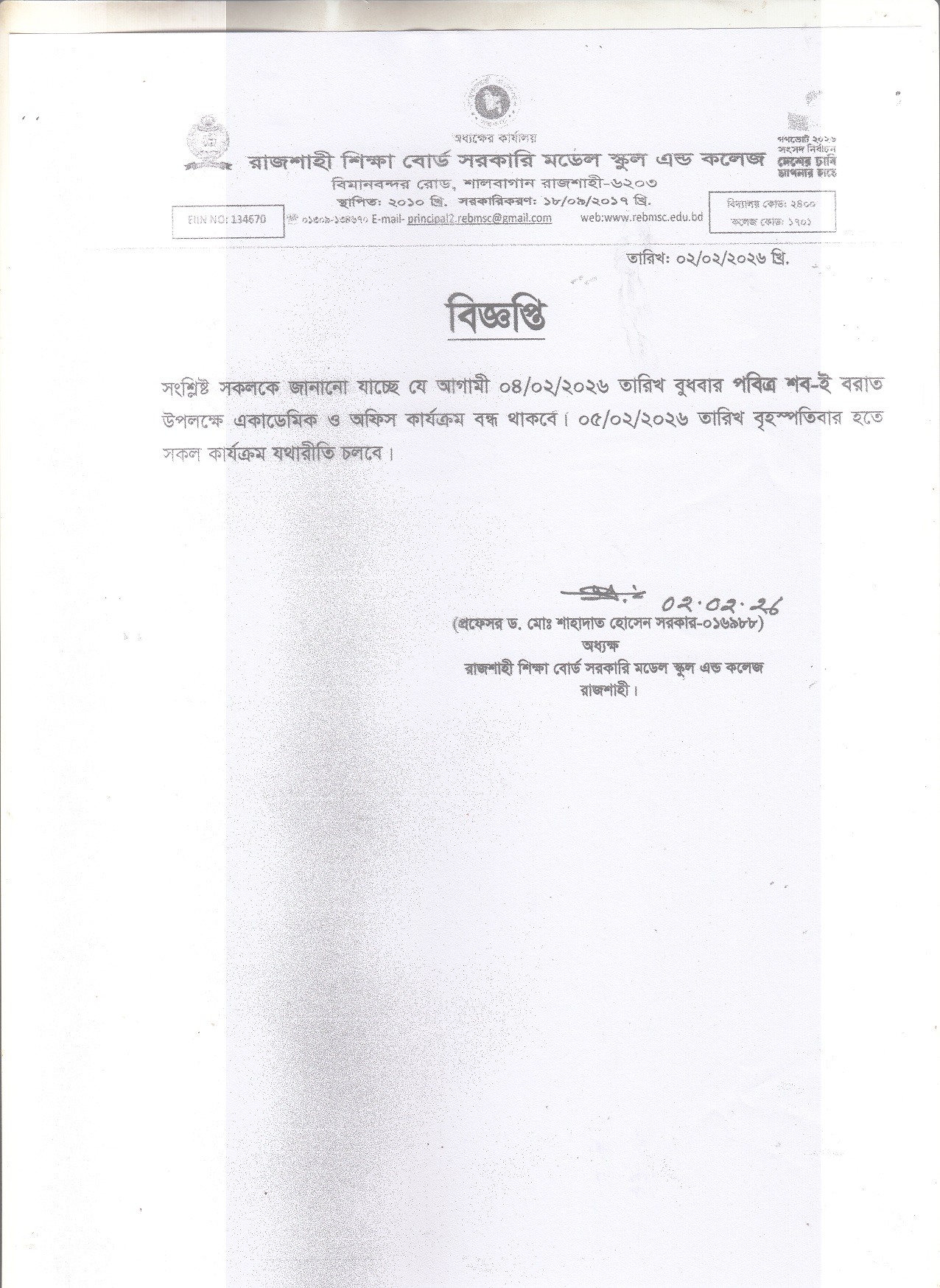 পবিত্র শব-ই বরাত উপলক্ষে ছুটি সংক্রান্ত।