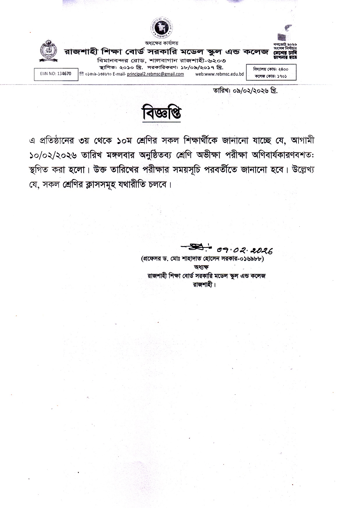 শ্রেণি অভীক্ষা পরীক্ষা স্থগিত সংক্রান্ত।