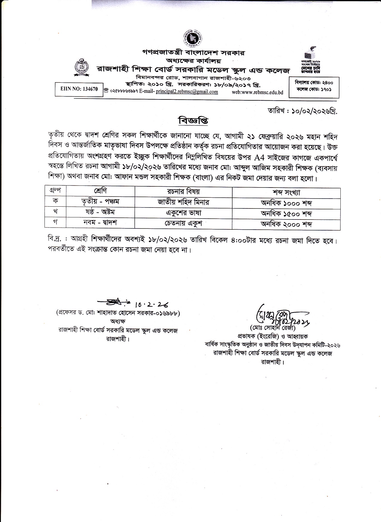 শহিদ দিবস ও আর্ন্তজাতিক মাতৃভাষা দিবস উপলক্ষে রচনা প্রতিযোগিতা
